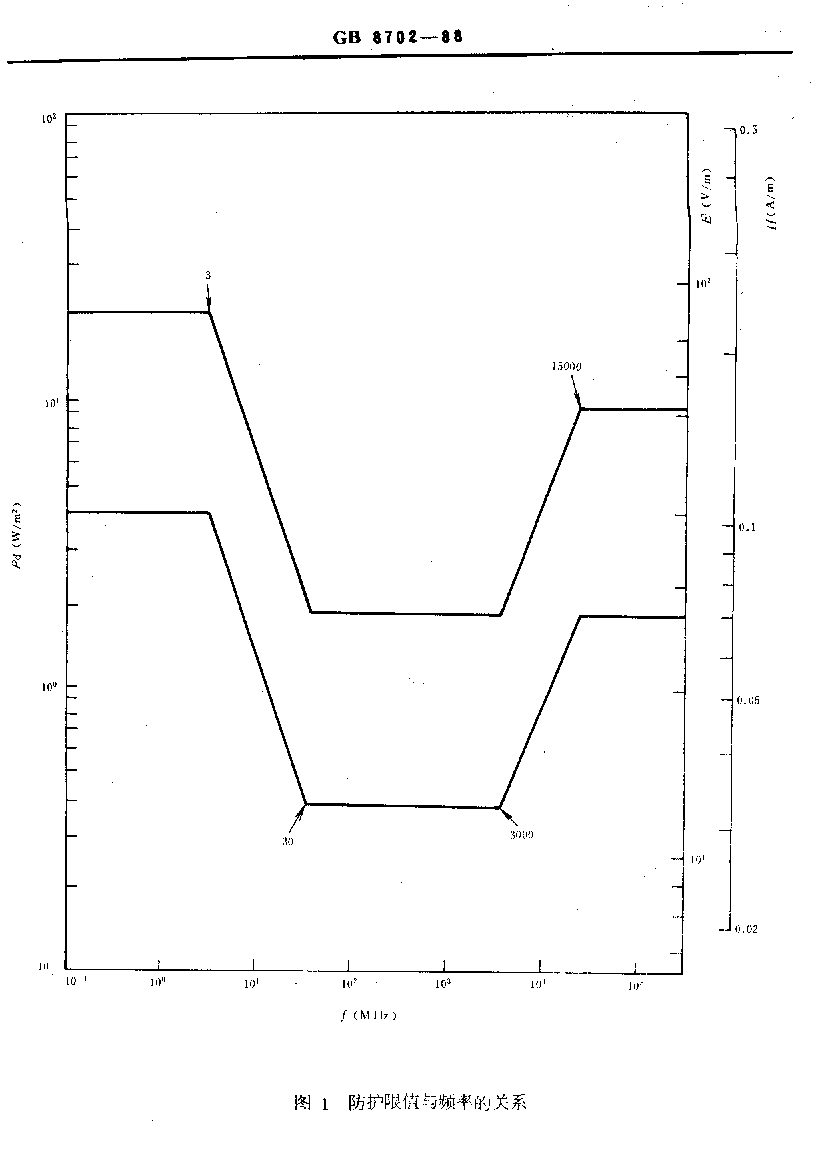 1.3 本规定中防护限值的适用频率范围为 100 k Hz~ 300 GHz。防护限值与频率的关系见下图。